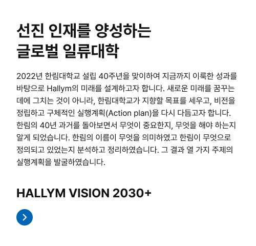한림대학은 1982년 건학 이래 '풍부한 인간성과 창조적 지성을 지닌 인재를 양성하고, 학술 및 문화의 진흥을 도모'함으로써 '개인의 성장, 사회의 발전, 국가의 번영, 인류의 행복에 기여함'을 실현하기 위해 매진해 왔습니다.
